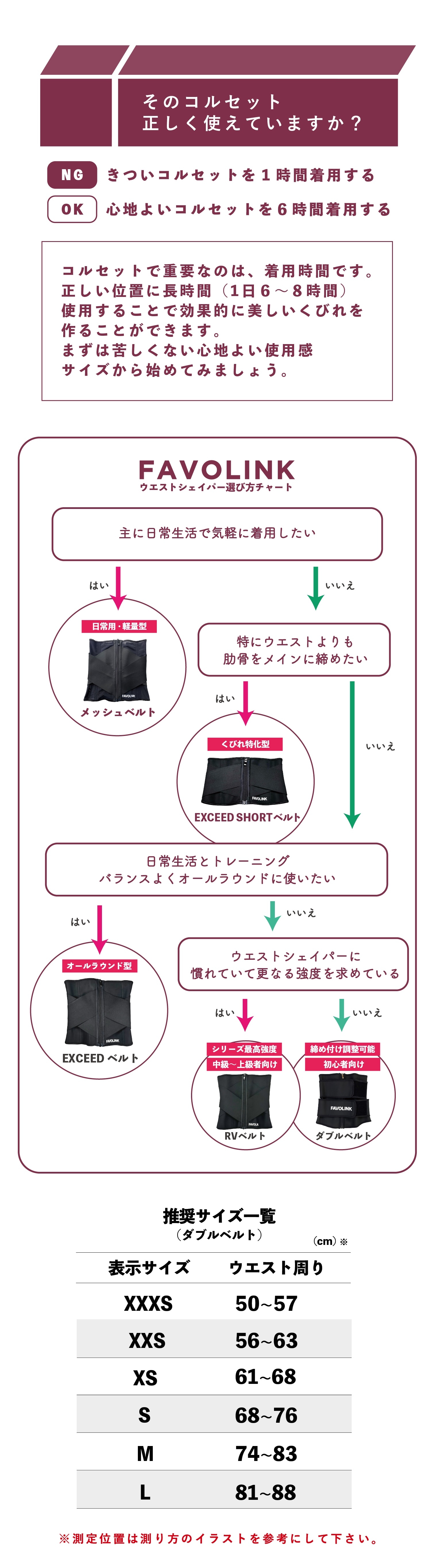 ※肋とウエストラインに沿って力いっぱいギュッと巻いて締めます。食事ができる程度の強さで、無理なく長時間・長期間着用することが大切です!