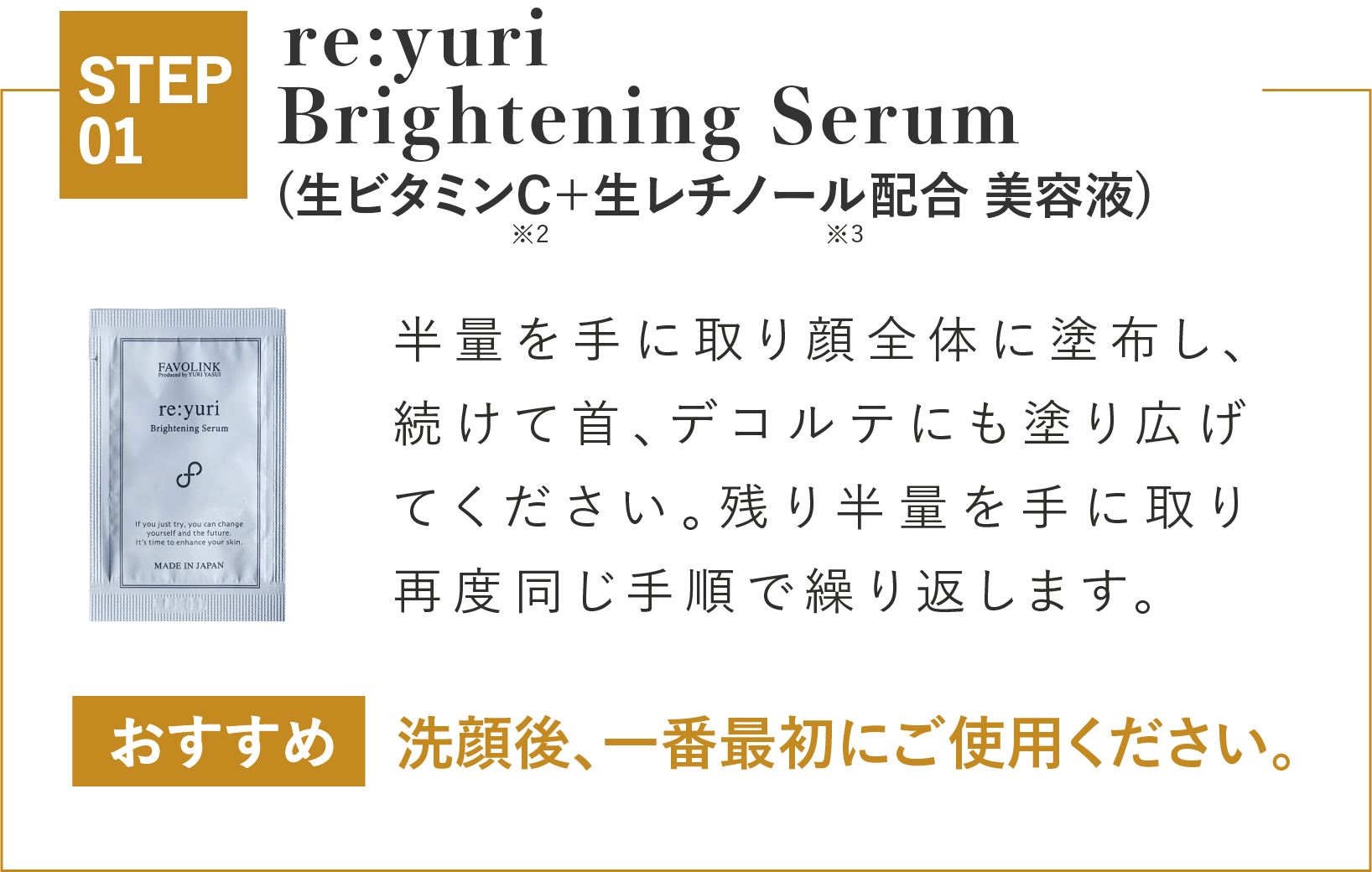 「re:yuri Brightening Serum」は、脱酸素製法®を用いた特殊な個包装になっています。そのため、肌に届くその瞬間まで1包1包が最高の鮮度に保たれています。使い残しはもちろん厳禁。肌同様、美容成分も酸化が大敵です。