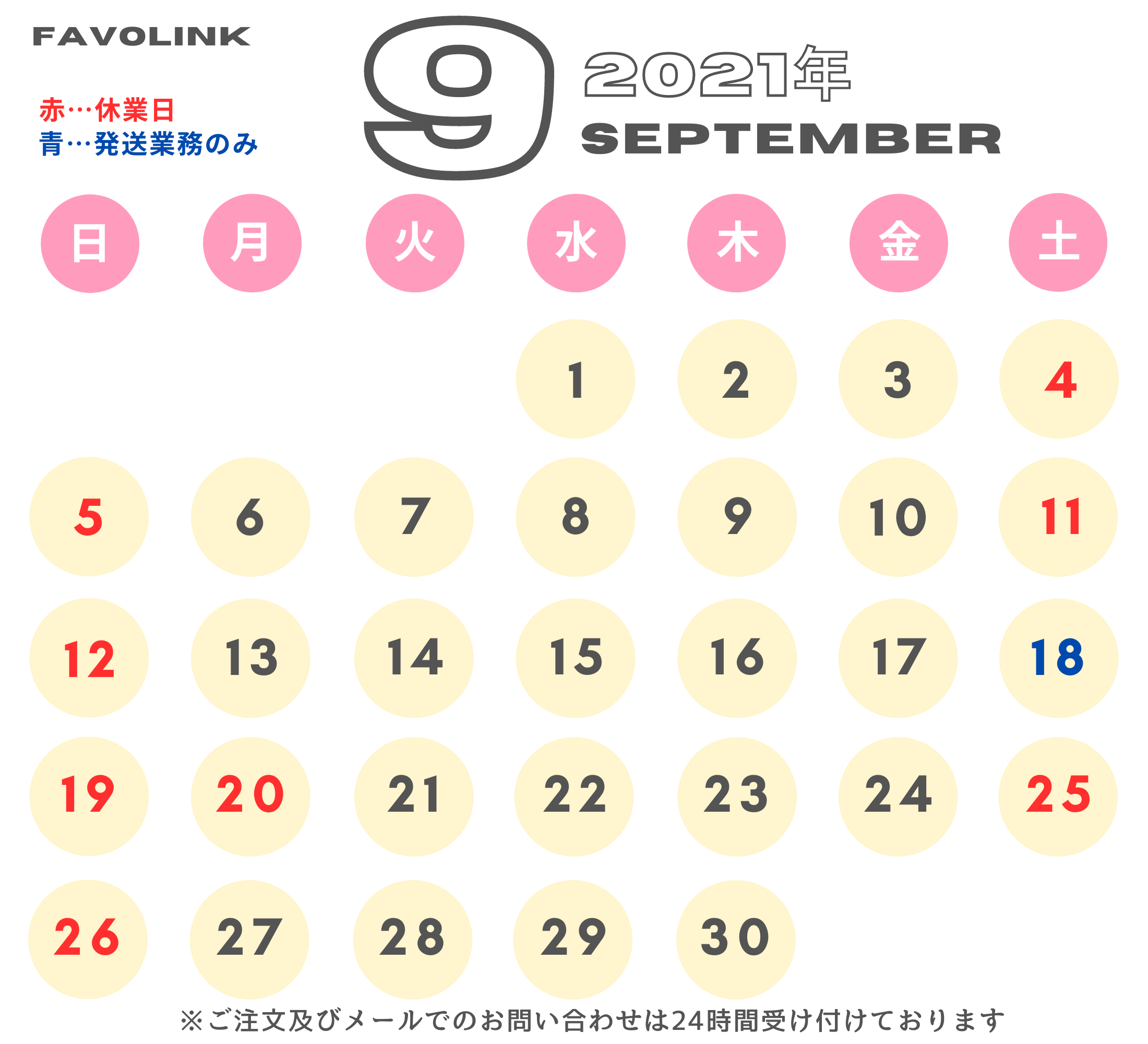 9月の営業日は下記の通りとなっておりますのでよろしくお願いいたします。