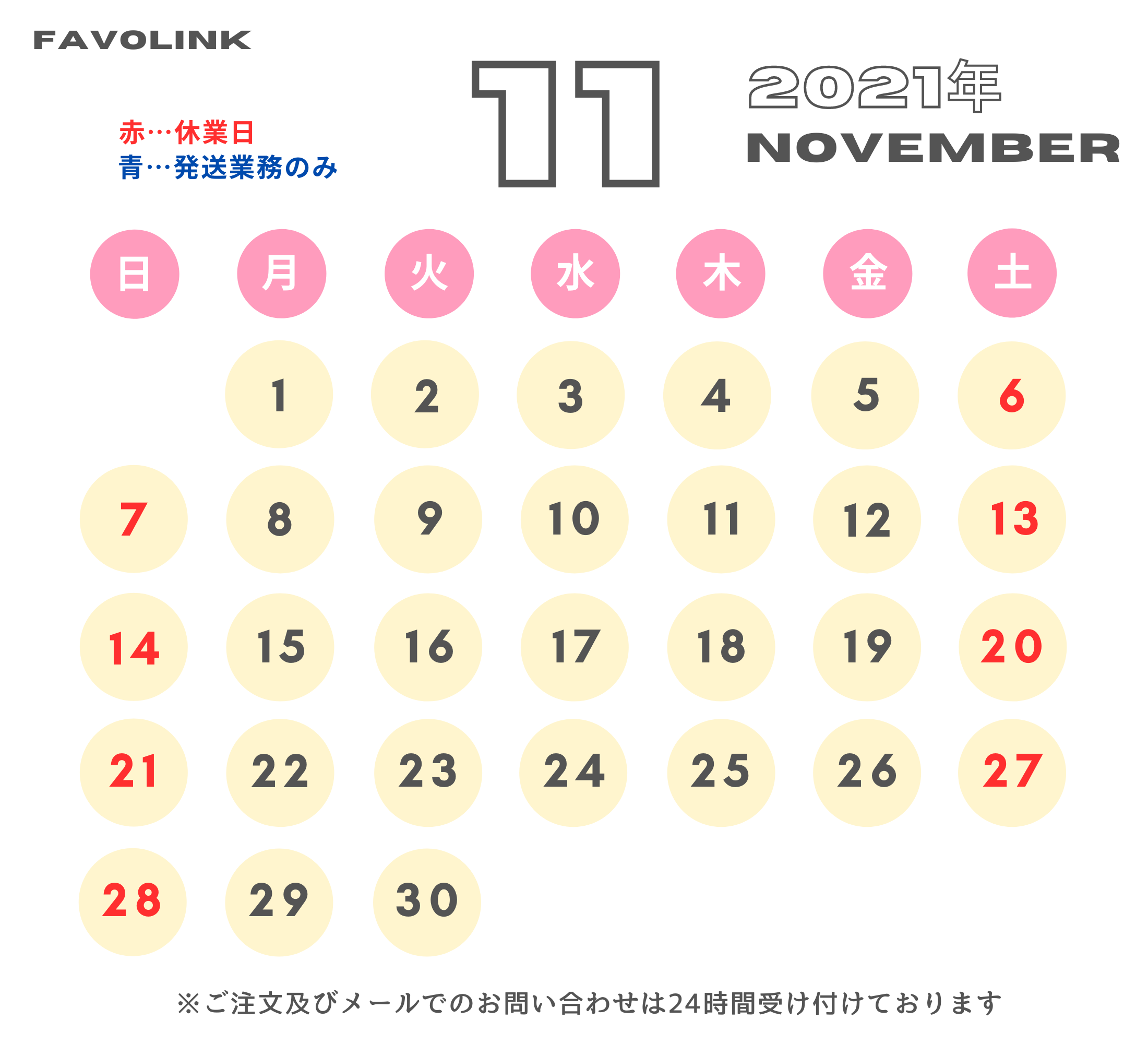 11月の営業日は下記の通りとなっておりますのでよろしくお願いいたします。